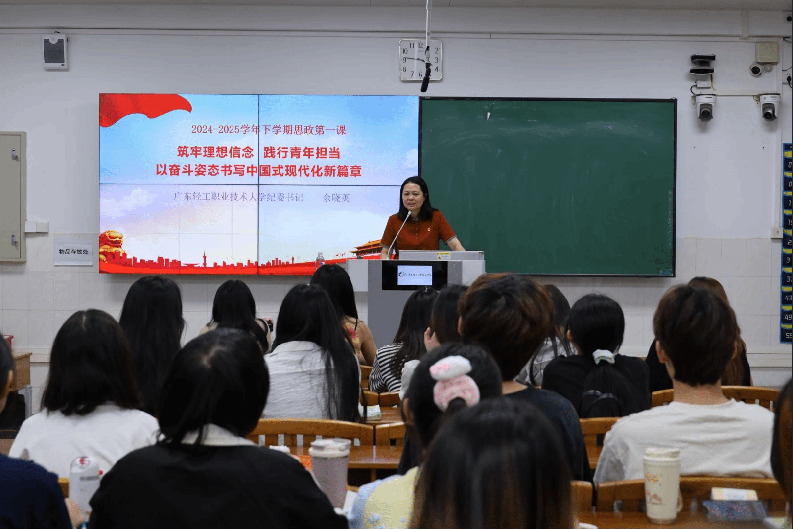 5月15日下午,学校党委副书记、纪委书记余晓英在新港校区教学楼203课室,为商英243、商英244班的同学们讲授2025年春季学期“思政第一课”。
